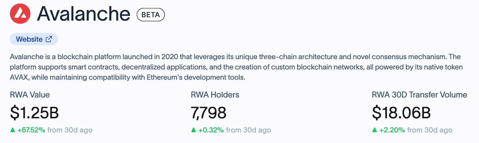 Avalanche Brings Wall Street Onchain with Dinari S&P Digital Markets 50 and Two Digital Asset Treasuries Dinari, a leading provider of tokenized U.S. public securities, has licensed the new S&P Digital Markets 50 Index. The tokenized index is designed to track a wide range of companies and digital assets connected to the crypto ecosystem, combining cryptocurrencies and publicly traded crypto-linked equities into one index. Also announced in October, two new digital asset treasuries launched to expand institutional access to Avalanche: AVAX One and AVAT (Avalanche Treasury Co.). Both aim to bring large-scale, publicly traded capital into the Avalanche ecosystem by providing exposure to AVAX and investing in projects that grow on-chain finance. Together, they mark a major step toward connecting traditional markets with blockchain-based assets and activity on Avalanche. Network Highlights RWA TVL Surges on Avalanche The RWA market on Avalanche continues to accelerate, with TVL rising 68% in just one month to $1.24B. The growth comes from a combination unique to Avalanche, bringing together institutional-scale tokenization projects and Avalanche’s compliant and customizable infrastructure, making it a go-to choice for a wide variety of traditional assets. The month was capped off by BlackRock moving $500M+ of its BUIDL fund to Avalanche.