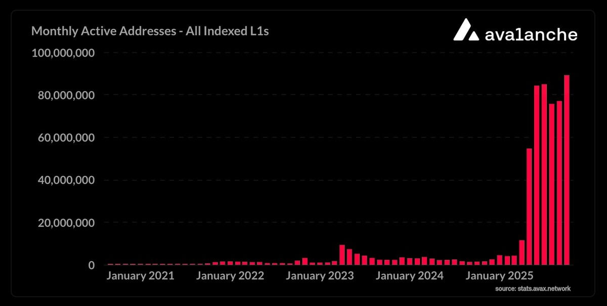 Source as of 11/01/25: RWA.xyz All Time High for Monthly Active Addresses across L1s The Avalanche network recorded a new monthly active-address high in October, reflecting markedly elevated user engagement onchain.